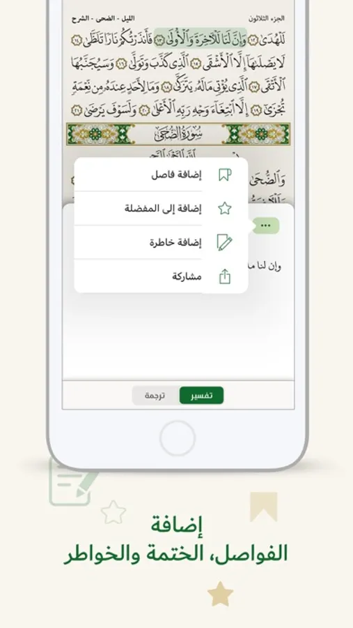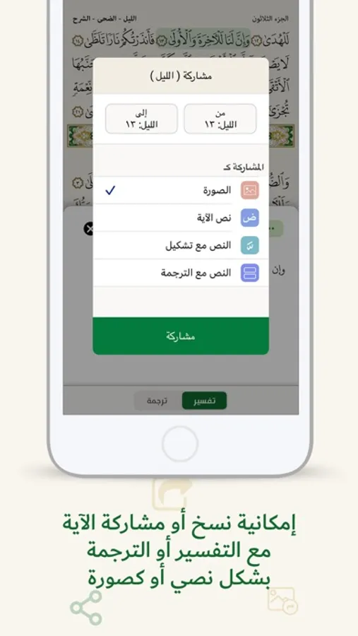 • إمكانية مشاركة الآية مع التفسير أو الترجمة بشكل نصي أو كبطاقة.