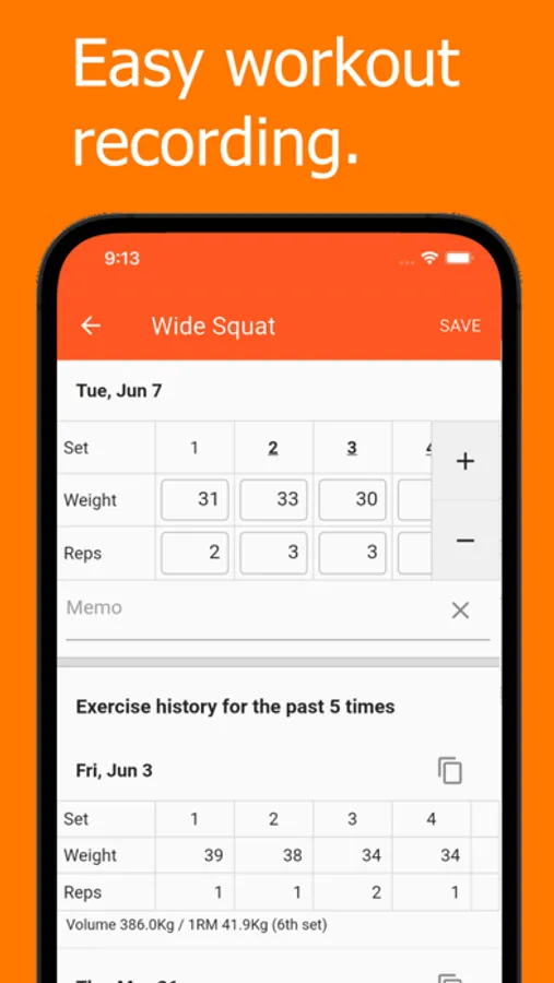 To enter your training record, just enter the weight and reps in the input box for each set, one after another.