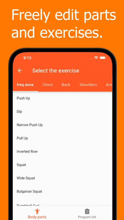 In addition, the most frequently performed training exercises are automatically displayed in the "freq. done" tab to make it easier for you to select them.