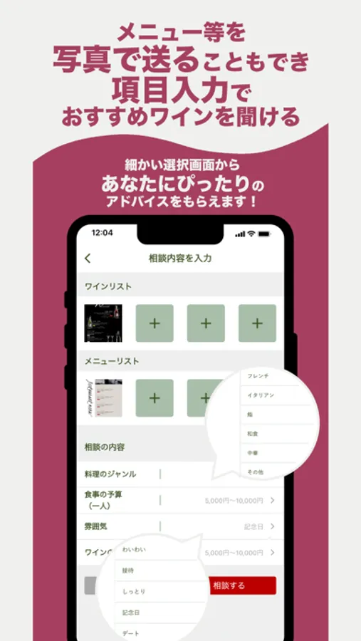 ·雰囲気、予算、料理のジャンルなど簡単入力でソムリエさんにおすすめワインを聞くことができます