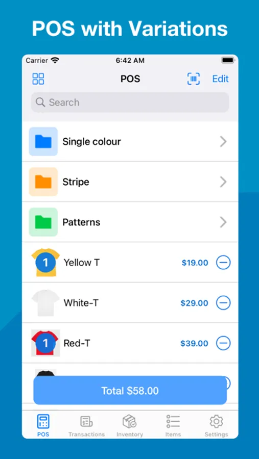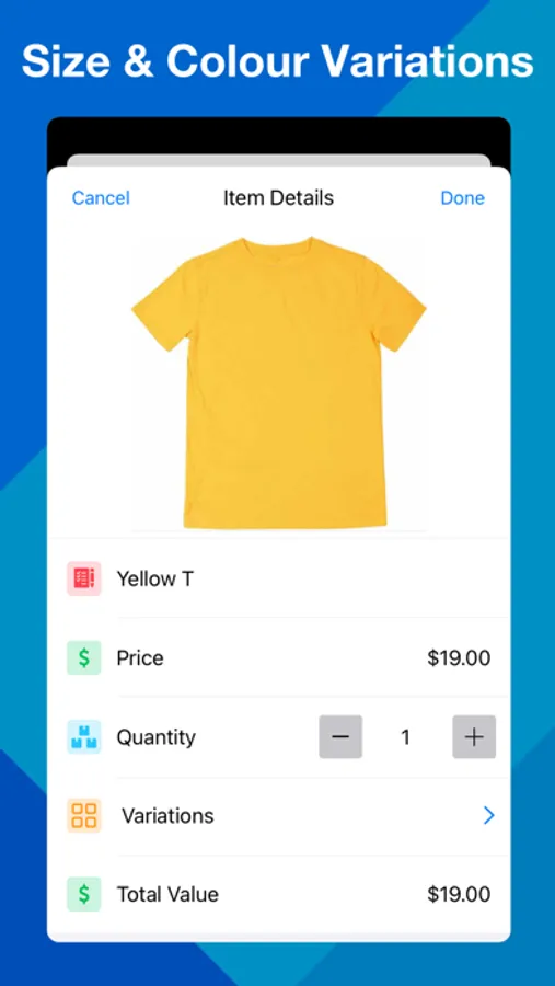 Shop Inventory Tracker & POS allows you to use Size (e.g. S, M, L, XL) and Colour (e.g. Red, Pink) variations in your items.