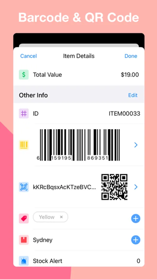 - Easily link Barcodes and QR code to any of your items