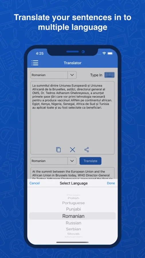6- There is a feature in our app that you will not find in any other app is- Users can write the sentences in the selected language and translate them into the other selected language also they can copy and share the translated text with anyone.