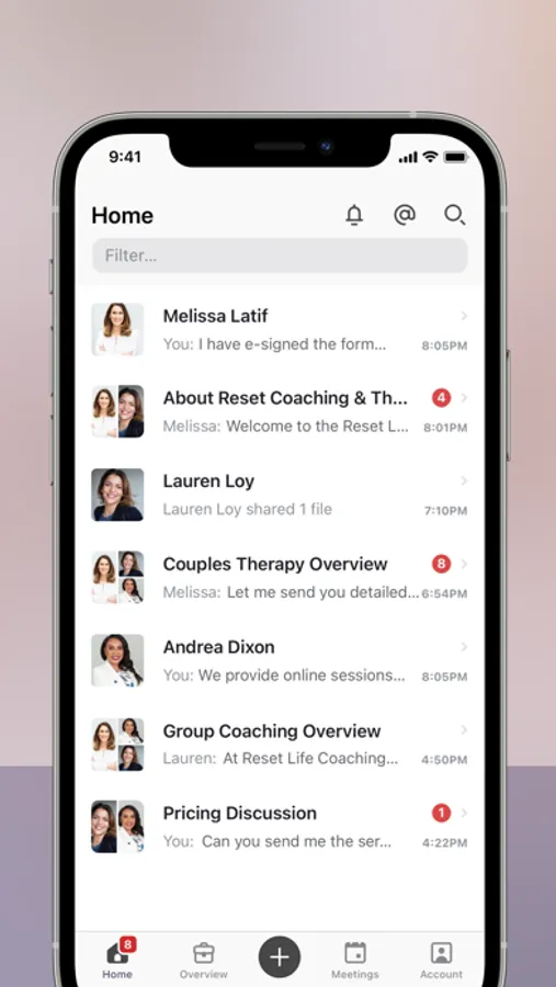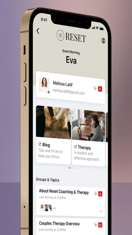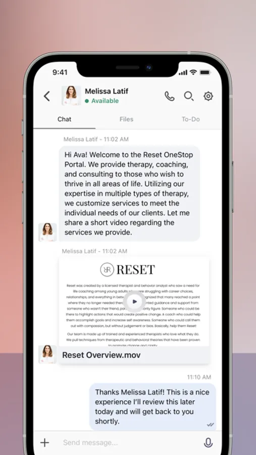 The Reset App combines therapy and coaching to offer clients the tools they need to thrive in all areas of life. Use the one-stop app to interact with our team via private instant messaging, face-to-face video meetings, securely share documents, e-sign files, and more. Reset with our unique approach to mental health and wellness — right at your fingertips.