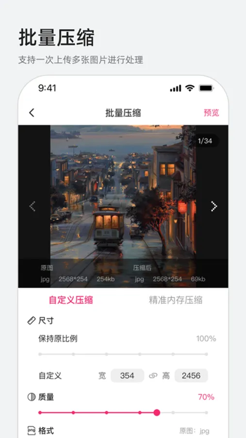 单张压缩:对单张图片进行质量压缩,可同时调整图片尺寸大小以及格式;支持精选内存压缩,直接输入想要的尺寸大小直接压缩;