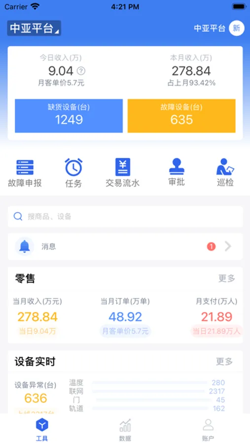 本APP面向售货机运营商的管理人员、巡检维修人员、补货员等用户,用来查看机器实时状态数据、分析销售数据、分析用户活跃度、进行故障管理巡检管理、实时接收推送信息等。