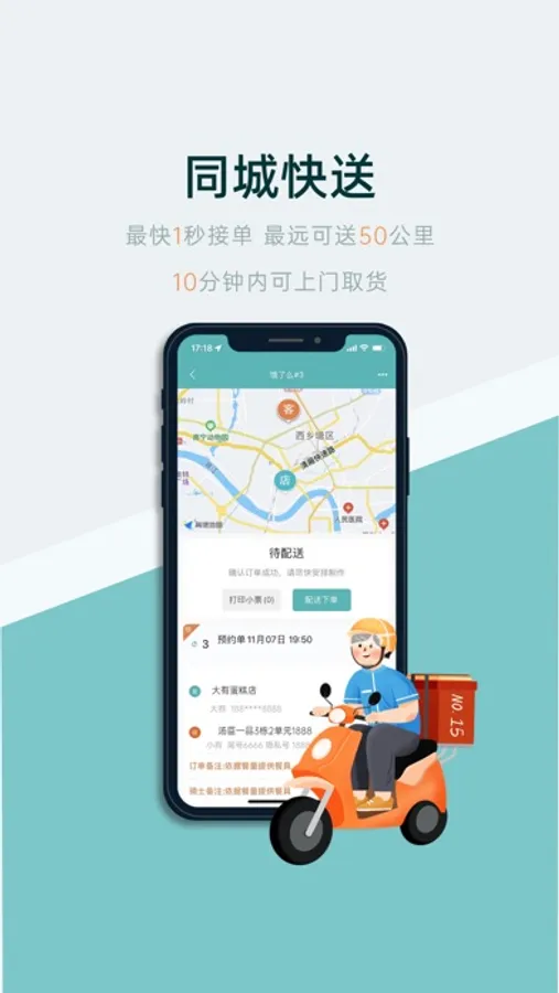 全城配送,最快1秒接单,10分钟内上门取货,最远可送50公里!