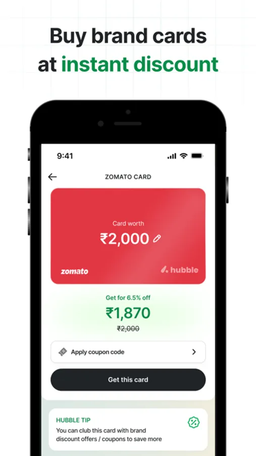 Getting started is easy - download Hubble, sign-up and buy gift cards of 100+ brands at the best discount. Shop across all top brands like Amazon, Flipkart, Swiggy, Zomato, Uber, Myntra, Nykaa, Yatra, Bigbasket, Decathlon, PVR, Urban Ladder and more and save money.