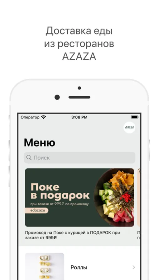 Как сделать заказ в приложении “AZAZA”: выберите понравившиеся позиции из меню, добавьте их в корзину и перейдите на экран оформления заказа (по нажатию на иконку корзины).