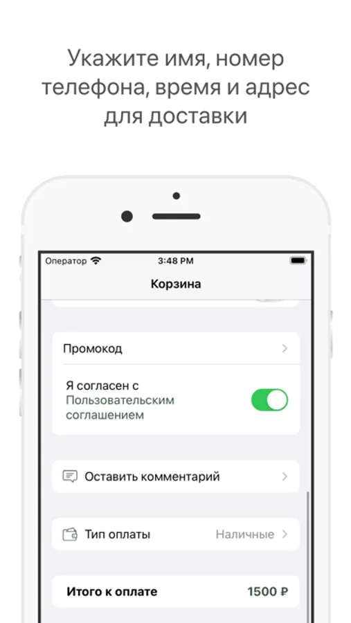 На экране заказа добавьте свою контактную информацию для первого заказа: Имя, Номер телефона и адрес электронной почты, чтобы получать уведомления об оплате.