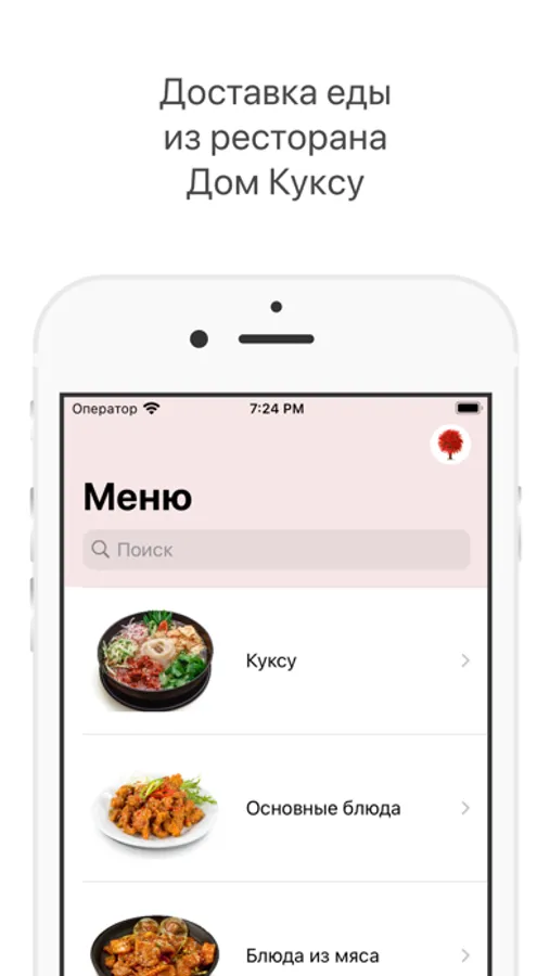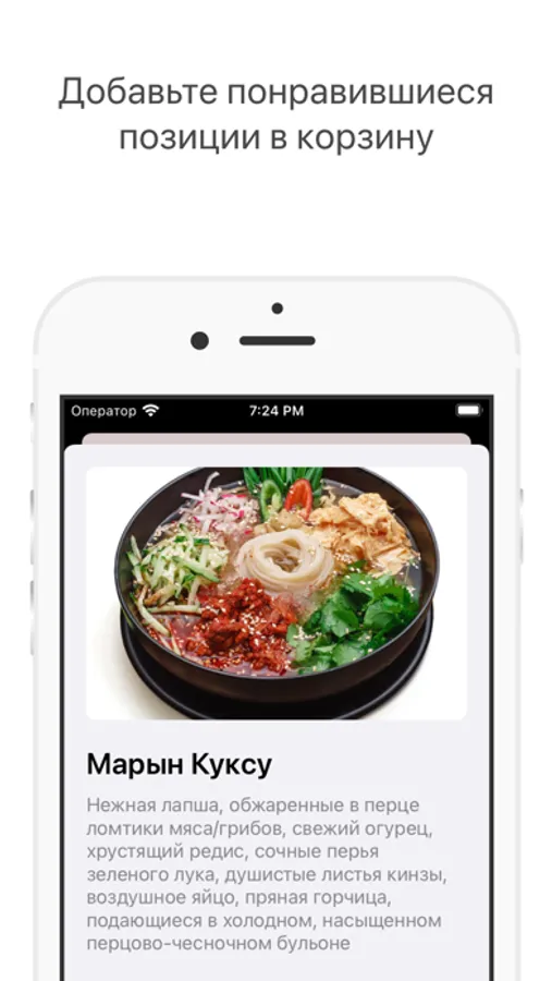 Как сделать заказ в приложении «Дом Куксу»: выберите понравившиеся позиции из меню, добавьте их в корзину и перейдите на экран оформления заказа (по нажатию на иконку корзины).