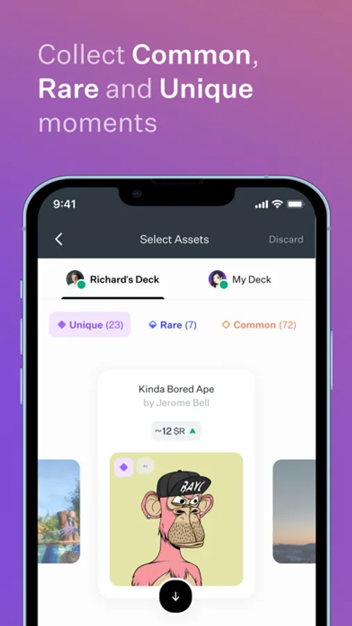 Upload 3 photos/videos to create a Pack. Assign a rarity type to each of the 3 Cards: a Unique, a Rare, and a Common. Your choices will determine the scarcity of each Card.