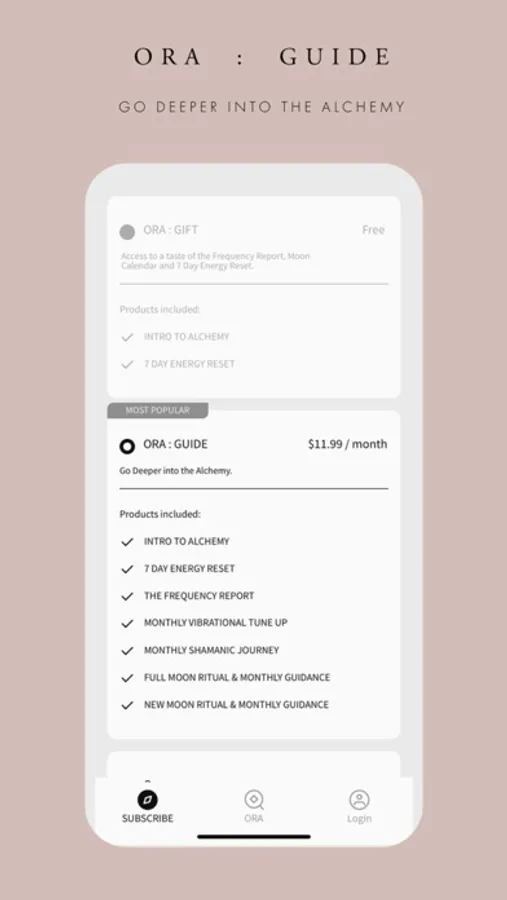 LEVEL 2 : ORA : GUIDE is your day-to-day spiritual support in your pocket, where monthly curated alchemic experiences are perfectly timed based on the energetics of the moment, designed to help you navigate the world as your most aligned and vibrant Self.