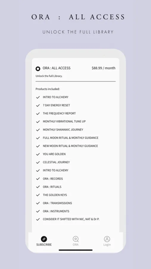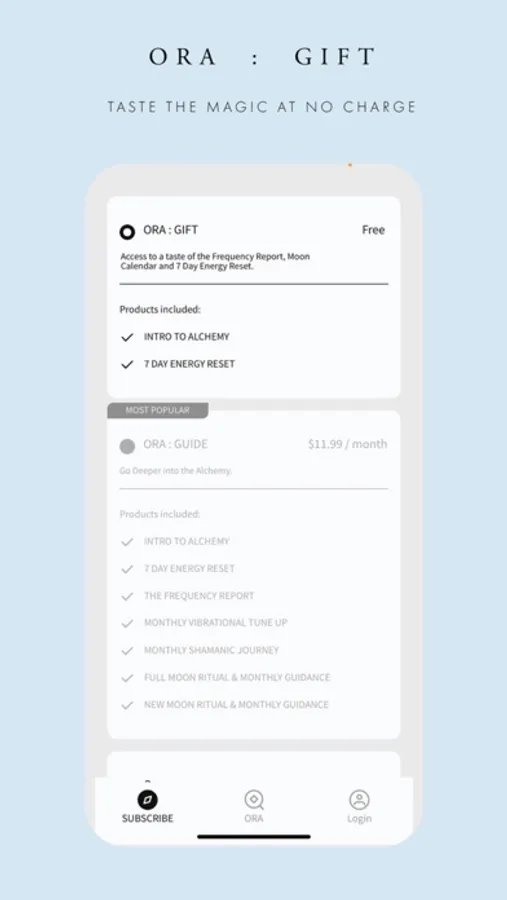 The download of the ORA GUIDE App is free of charge. Choose the ORA : GIFT plan in the app and receive free access to a limited offering of ORA GUIDE App content. Go deeper in the magic by upgrading to the ORA : GUIDE purchase plan with an ever changing monthly curated offering or ORA : ALL ACCESS which opens up the entire library.