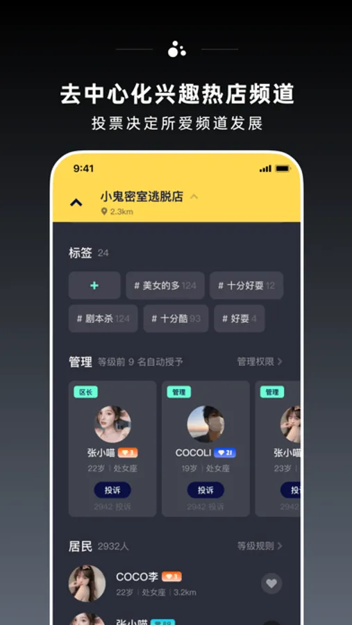 让你快速发现同城附近的“CO区互动交友频道”——由“剧本杀、密室逃脱、电玩游戏厅、健身房、舞蹈练习室、网红餐厅、新奇体验、电竞网咖、咖啡馆、酒吧”等10+类线下热门店铺的兴趣娱乐场景构成。