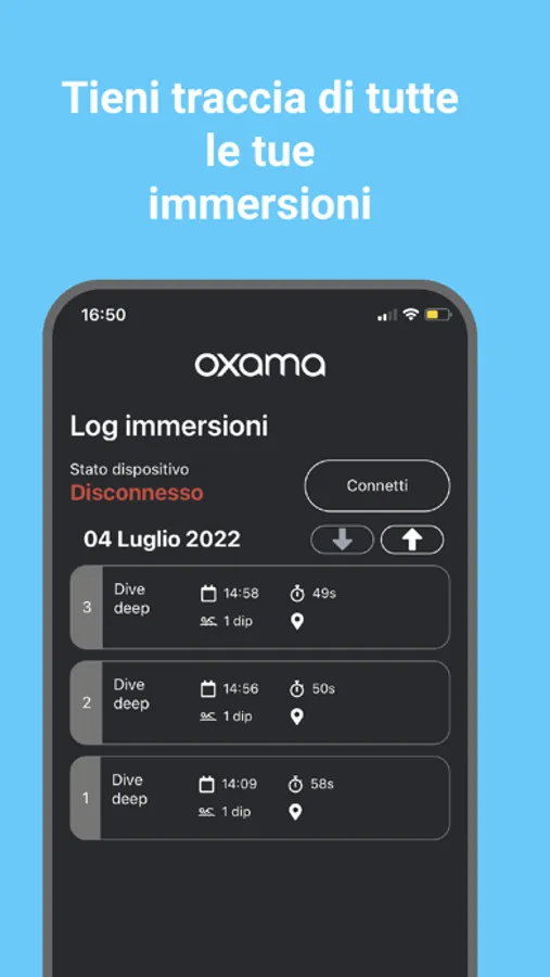 Gestici i tuoi dispositivi OXAMA: analasi dati, aggiornamenti firmware, impostazioni freediving.