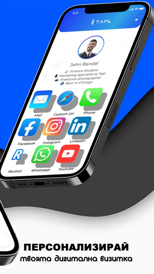 Приложението на TAPL ще бъде твоят верен помощник в изграждането на страхотно първо впечатление на всяка среща, било то в бара или в офиса. Комбинацията между това приложение и нашите NFC продукти, позволяват на потребителите да изживеят един изцяло нов прочит на конвенционалната идея за визитни картички и да се почувстват като част от едно по-иновативно, по-впечатляващо и по-екологично бъдеще.