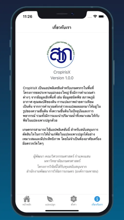 CropIrisX เป็นแอปพลิเคชันสำหรับเกษตรกรในพื้นที่โครงการชลประทานแม่กลองใหญ่ ซึ่งมีการคำนวณค่าต่างๆ จากข้อมูลเชิงพื้นที่ เช่น ข้อมูลชนิดพืช สภาพภูมิอากาศ คุณสมบัติของดิน การแปลภาพถ่ายดาวเทียม เป็นต้น จากการคำนวณดังกล่าวจะแปลผลออกมาให้อยู่ในรูปของความชื้นดิน ทั้งความชื้นดินในปัจจุบันและการพยากรณ์ รวมทั้งมีการแนะนำปริมาณน้ำที่เหมาะสมให้กับพืชในแปลงเพาะปลูกด้วย