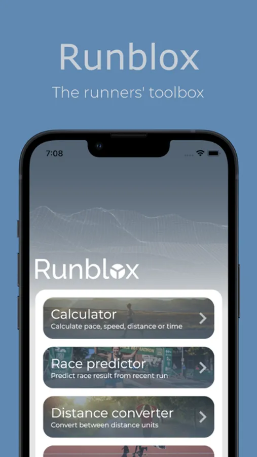 Runblox is a toolkit for runners and athletes, containing simple, yet useful tools. The calculator will take two variables of distance, pace and time and calulate the third, the race predictor will predict future race finish times based on a recent run, and the converters will forever get rid of the problem of converting from the metric to the imperial system for distance and speed.