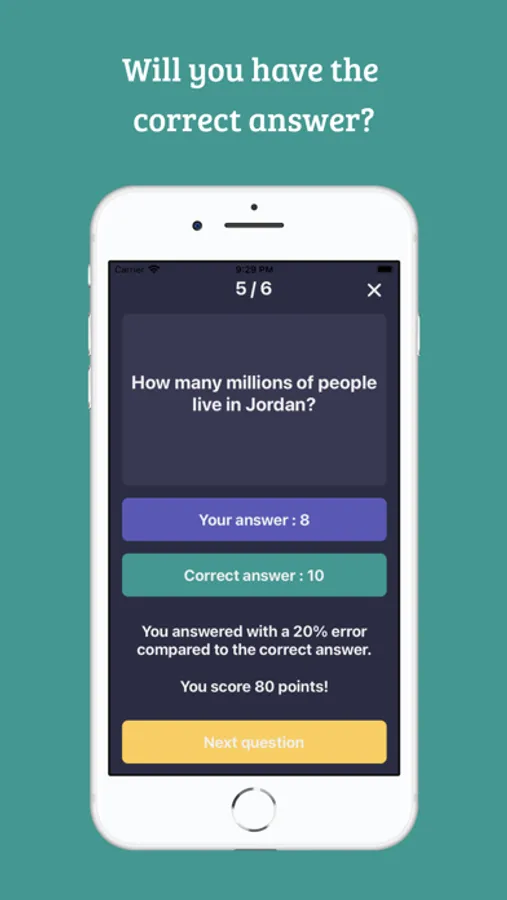 You are given a series of 6 questions whose answers are all numbers. For each question, the goal of the game is to give an answer that is as close as possible to the correct answer. The closer you are to it, the more points you score.