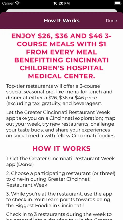 Let the Greater Cincinnati Restaurant Week app take you on a Cincinnati exploration; map out your week, try new restaurants, challenge your taste buds and share your experiences on social media with fellow Queen City foodies.