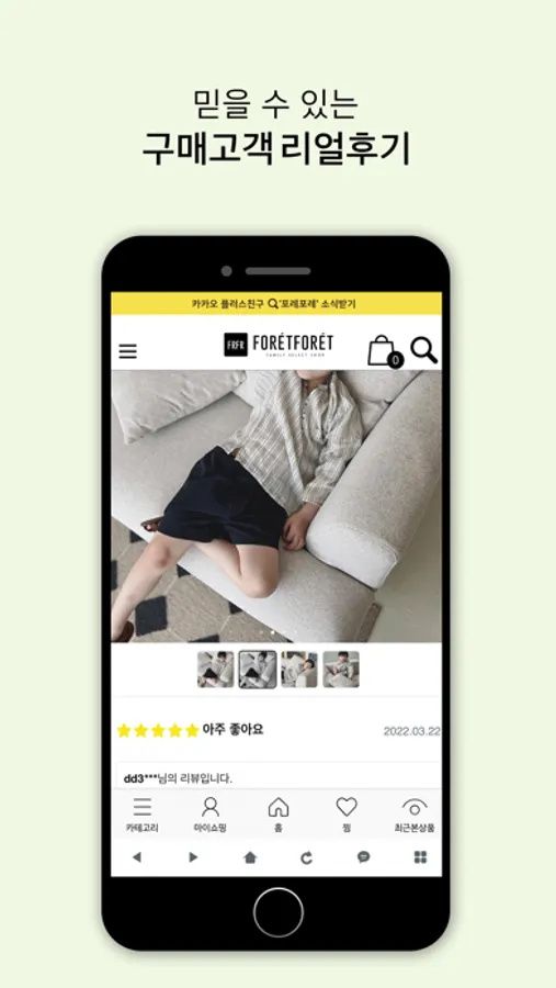 구매했던 상품을 일일이 찾을 필요 없이 앱에 접속하면 자동으로 뜨는 간편리뷰 기능으로 편리함을 더했습니다.