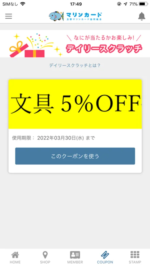 ※本アプリにおけるデイリースクラッチ・スタンプラリー・クーポンは玉野マリンカード協同組合が独自に行うものであり、米アップル社は全く関係ありません。