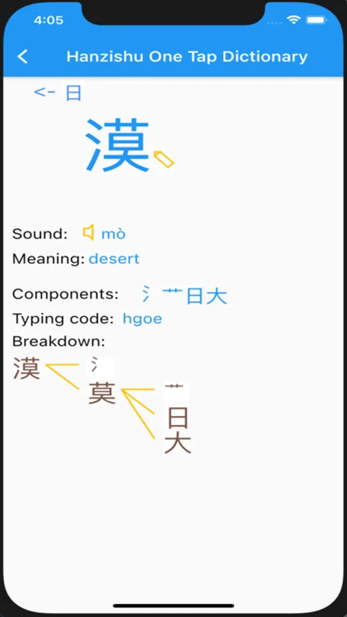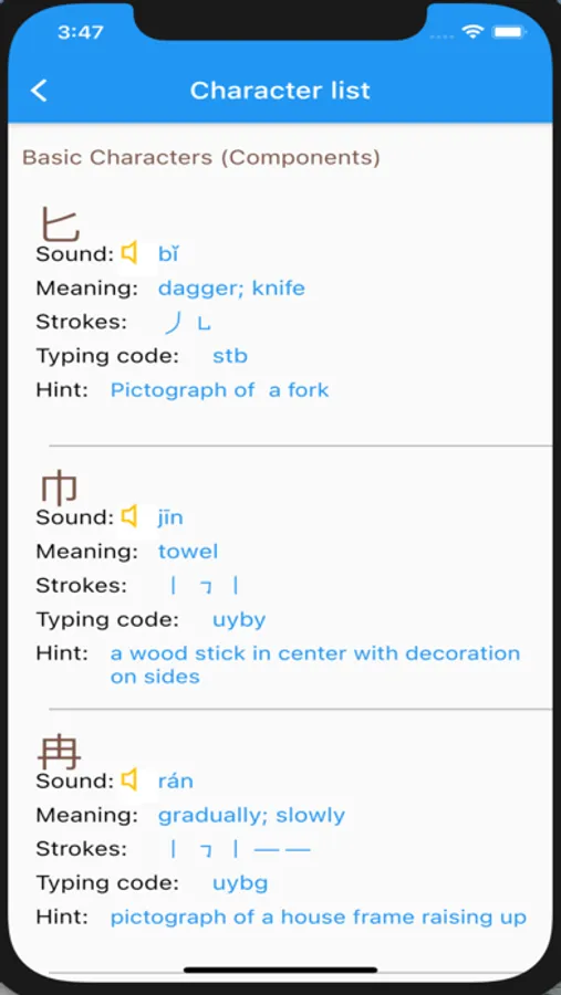 A Chinese dictionary that’s organized based on Basic Characters. Searching a Character by searching the first Basic Character it contains. Contains nearly 4,000 Characters.
