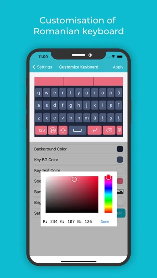 • Change colours for the Background colour, Key background colour, Keyboard text colour, Suggestion box colour etc, so that typing does not seem boring and monotonous with this Romanian keyboard for iOS.