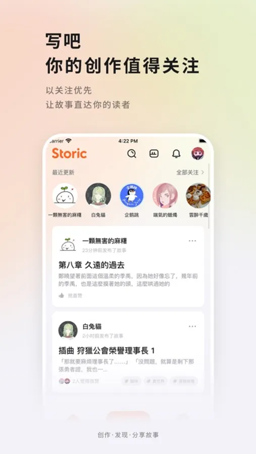 被看见是每一位创作者持续创作的动力,我们通过Storic app、Storic社交媒体向人们推荐你的故事;我们会优先为读者展示他们关注作者的更新,你的创作不再会被读者错过。