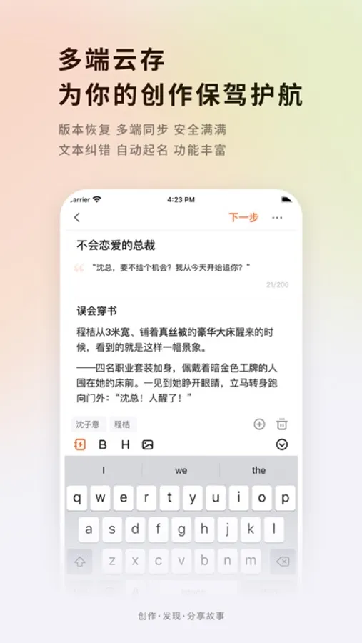 Storic相信每一个人心里都有一个精彩绝伦的故事,每一个人都是优秀的故事讲述者,天生的作家,无论是你亲身经历的故事,还是你脑海里天马行空的奇异世界,你都可以使用storic提供的创作工具写出来,让你丰富的内心世界和创造力被更多的人读到,和他们产生共鸣。