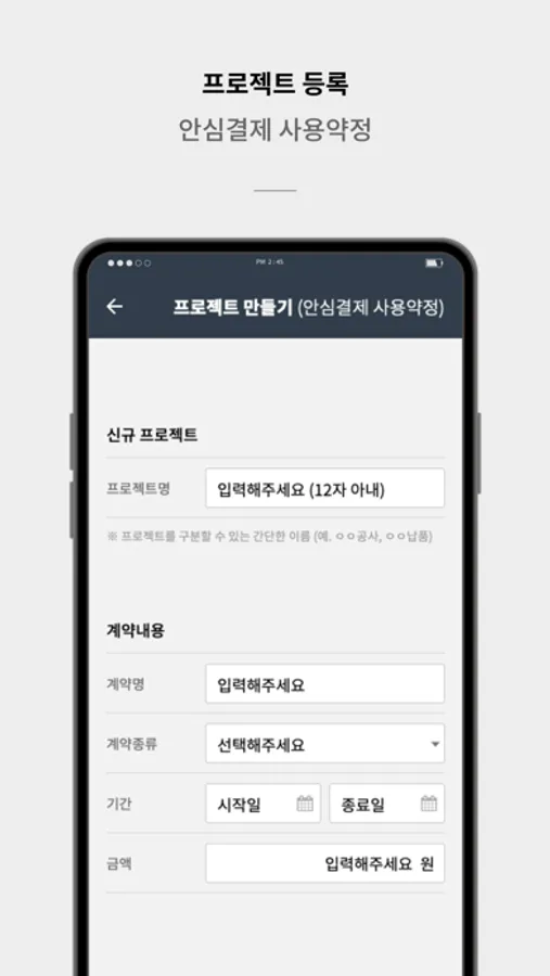 - 고객(발주자) : 공급자에게 지급할 대금을 안심계좌로 예치하여 먹튀나 사기방지, 실시간 진행사항 확인하고 프로젝트관리나 정산 등 서비스 이용수수료 무료입니다.