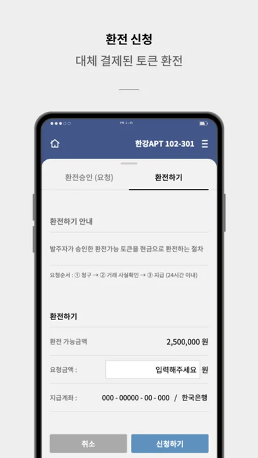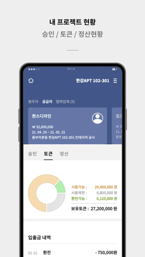 - 협력업체 : 대체결제된 토큰으로 자재구매나, 인건비 등을 지급할 수 있으며, 고객이 예치한 계좌에서 직접 환전받는 구조로 약정한 기일에 결제지연 없이 결제됩니다.