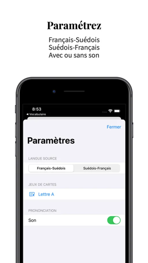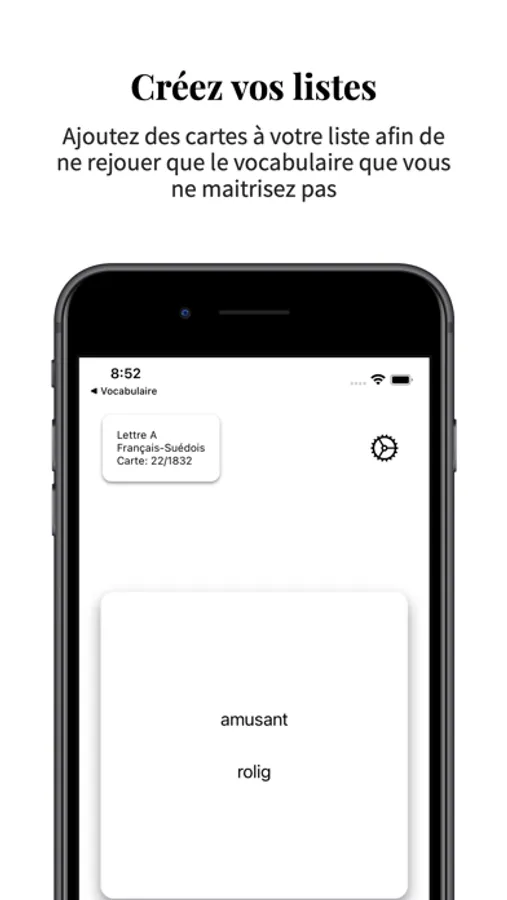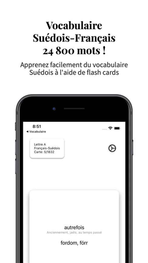 Cette application vous pemettra d’apprendre ou de réviser le vocabulaire Suédois en feuilletant des cartes de vocabulaire (“flash-cards”). Essayez de deviner la traduction du mot ou de l’expression présenté, puis, un tap sur la carte et la traduction apparait en dessous aussitôt. Une méthode agréable et efficace pour apprendre des mots et expressions en Suédois à son rythme. Un balayage (swipe) à droite ou à gauche vous permettra de passer à la carte suivante.