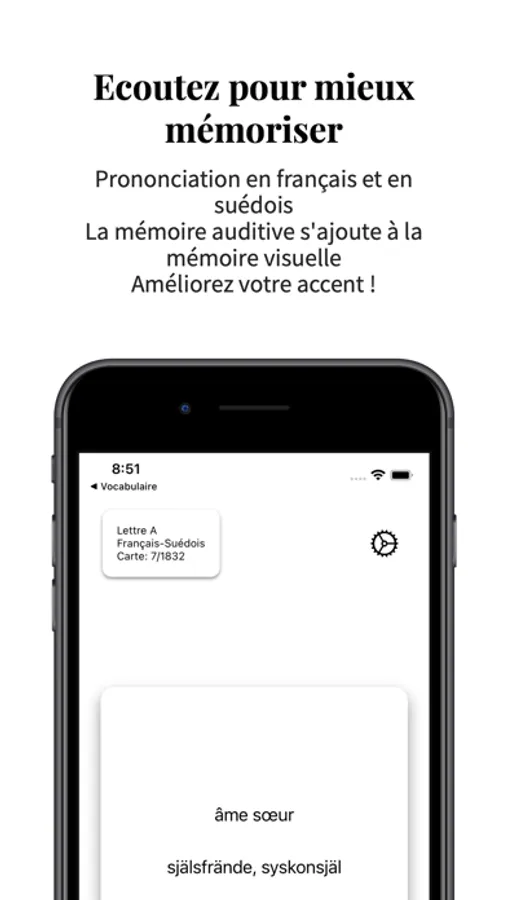 Les mots ainsi que leur traduction sont prononcés (en Suédois et en français) afin que vous puissiez bénéficier de la mémoire auditive. Par la même occasion, vous pourrez perfectionner votre accent en Suédois.