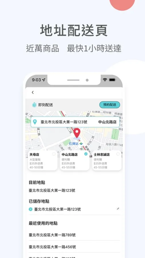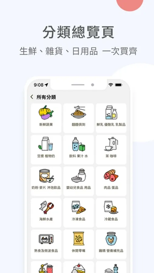 近萬件商品快速配送服務,包含生鮮、雜貨、生活日用品、小家電、五金、烘焙、熟食、便當、咖啡蛋糕、衣物等。
