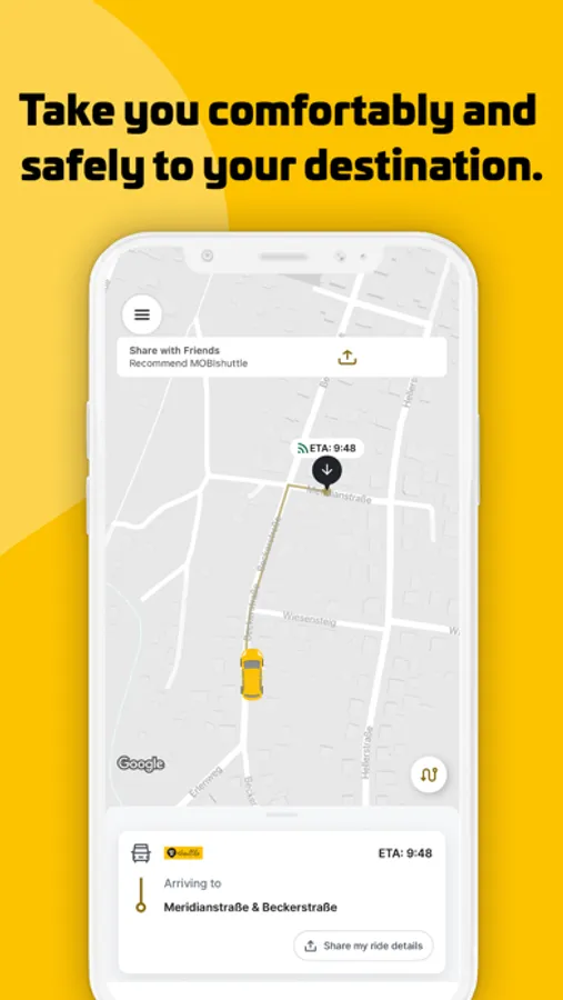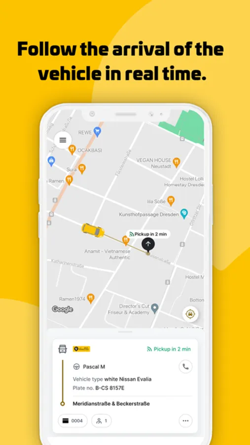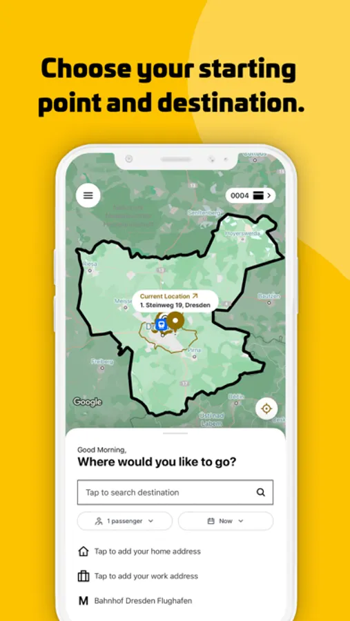 2) Book a ride: Choose your starting point and destination. Your location will be determined automatically, but you can also set addresses manually. Then enter the number of passengers and, if available, your valid public transport ticket. You can book journeys for multiple people - also barrier-free. Then choose your favourite from the suggested journeys and book it at the price shown. The app shows you the way to your boarding point, which you can easily reach by walking.