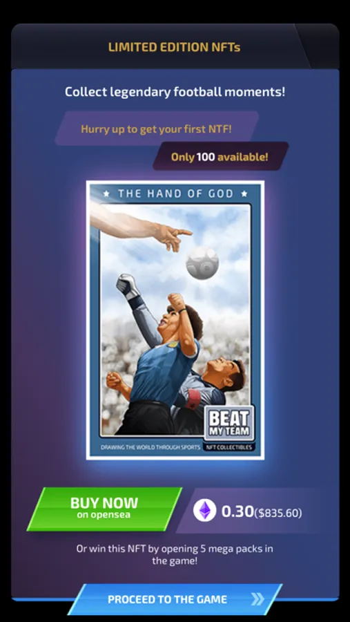 Play BEAT MY TEAM to win rare NFTs that capture football's most legendary moments. BMT is a fantasy football card collecting game, played with randomly generated football player cards who participate in the top football competitions globally. Create the best collection of top scorers, upgrade your player cards to the max, participate in daily contests by drafting the best team and score the most goals. Beat your opponents and shoot up the leaderboards. Play BEAT MY TEAM to win valuable NFTs worth thousands of $$$!