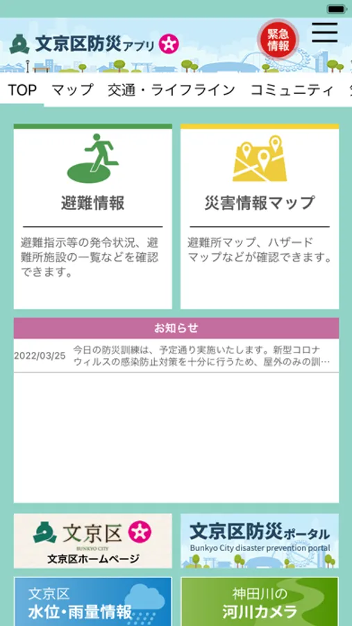 文京区が発信する各種防災関連情報をリアルタイムに受信できます。