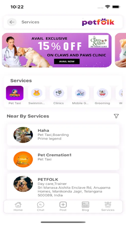 Petfolk helps in getting information regarding nearby pet friendly areas, users can book services like Grooming, Walkers, boarding, clinics, spas, resorts...etc.