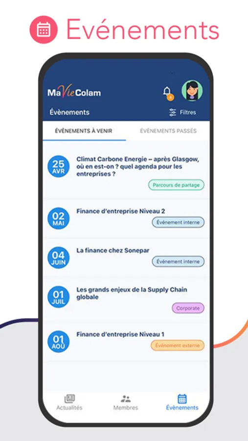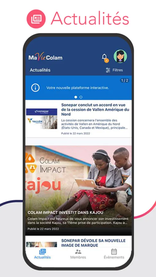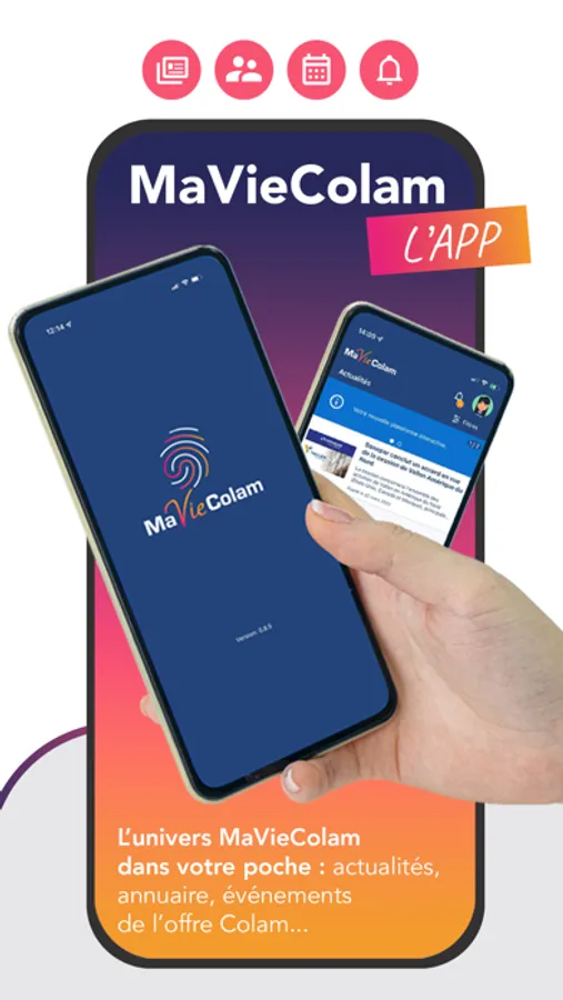 la nouvelle application MaVieColam vous permettra d’accéder facilement aux actualités, à l’annuaire ainsi qu’aux événements de l’offre Colam... et ce n’est qu’un début !