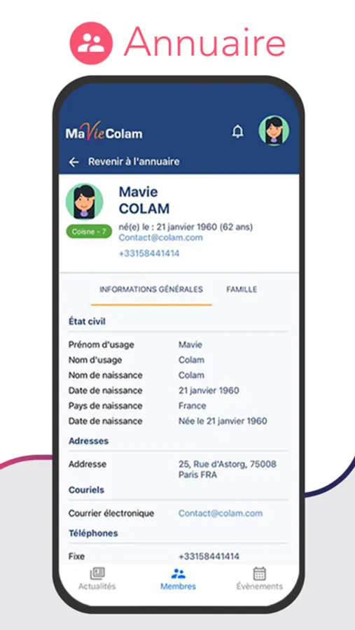 - L’ANNUAIRE de l’App vous donne accès à la liste de l’ensemble des Colams avec la possibilité d’ajouter les personnes de votre choix aux contacts de votre smartphone.