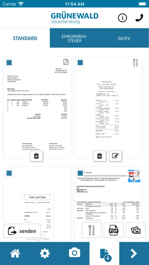 Machen Sie einfach ein oder mehrere Fotos von Ihren Belegen und versenden Sie diese mit einem Klick direkt aus der App heraus an Grünewald Steuerberatung