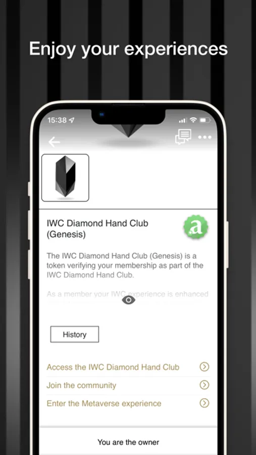 Interact with the IWC community in a whole new way with seamless access to exclusive IWC events and experiences in the metaverse and the real world. The highly exclusive IWC Diamond Hand Club will enhance your IWC experience with intangible values, merging the physical world with the digital one, and connecting you as an individual collector with the community of watch and NFT enthusiasts worldwide. Get yourself a membership NFT with one of the limited Diamond Hand Club tokens and let us welcome you to the club.