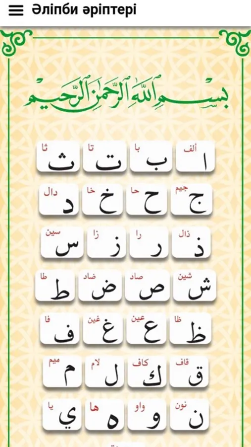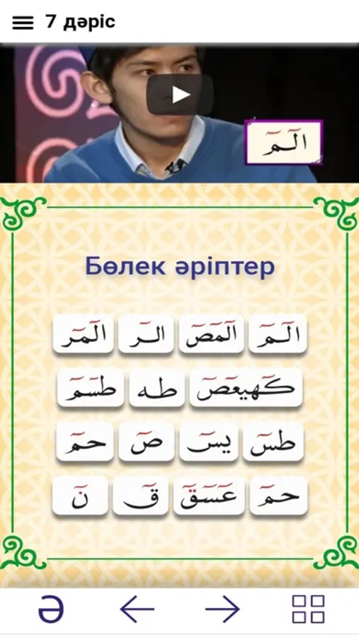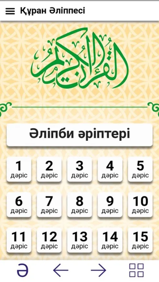 Құран әліппесі қосымшасы 20 сабақтан тұрады. Жоғары жағындағы ұстаздың видеосын көріп, астындағы әріптерді оқып қайталай аласыз.Барлық жастағыларға арналған. Ең жеңілдетілген үйрету жолымен аз уақытта Құран оқып үйренуге арналған қосымша.