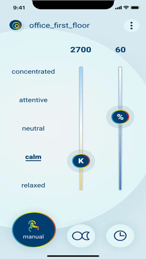- Manual Mode: Create personalized environments by changing the color temperature and light intensity, to adapt the lighting to the needs of any facility or activity.