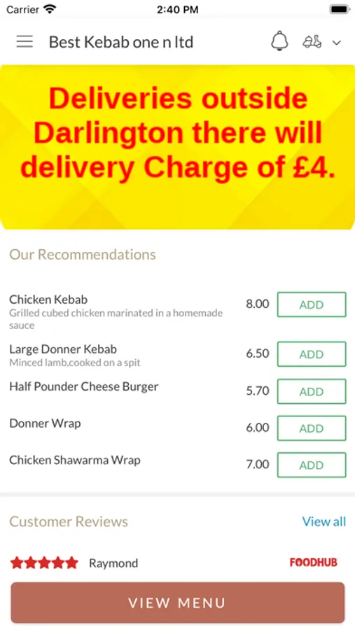Here at Best Kebab one n ltd, we are constantly striving to improve our service and quality in order to give our customers the very best experience. As a result, we are finally proud to unveil and introduce our latest improvement, our new online ordering app! You can now relax at home and order your favourite, freshly prepared meals from Best Kebab one n ltd in Darlington. You can even pay online!