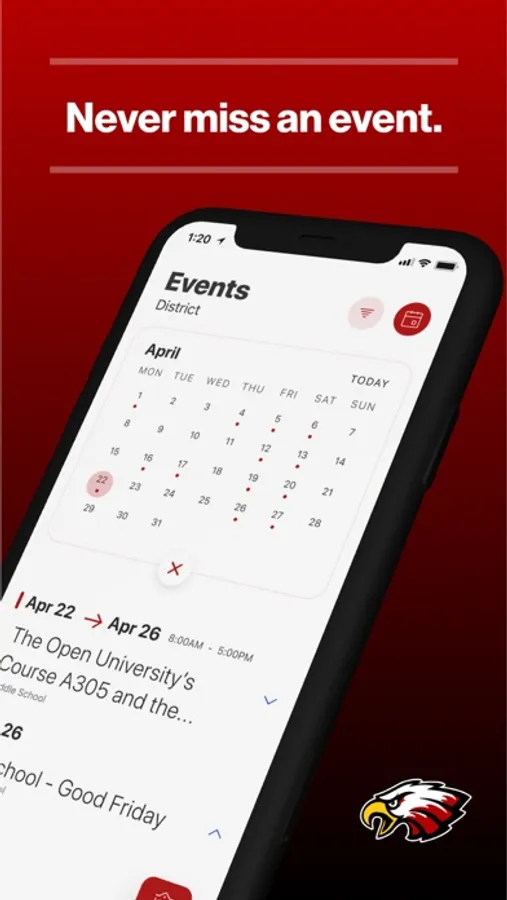 The event section shows a list of events throughout the district. Users can add an event to their calendar to share the event with friends and family with one tap.