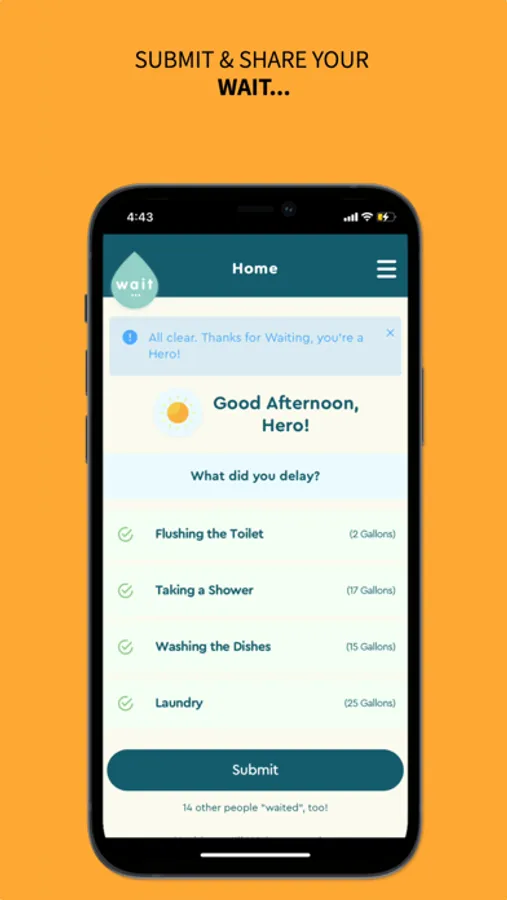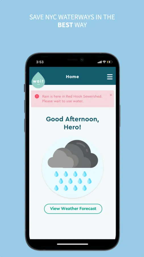 The Wait... app is an easy tool for New Yorkers to help keep NYC waterways clean. During heavy rains, the Wait... app will tell you it’s time to WAIT to use water, like doing laundry or washing dishes. When the rain passes the app will remind you it’s okay to restart. By WAITing, you make it easier for our sewers to do their job while helping protect NYC’s waterways and marine wildlife.