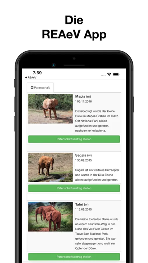 Mit der REAeV App können sie ganz einfach Elefanten Pate werden.